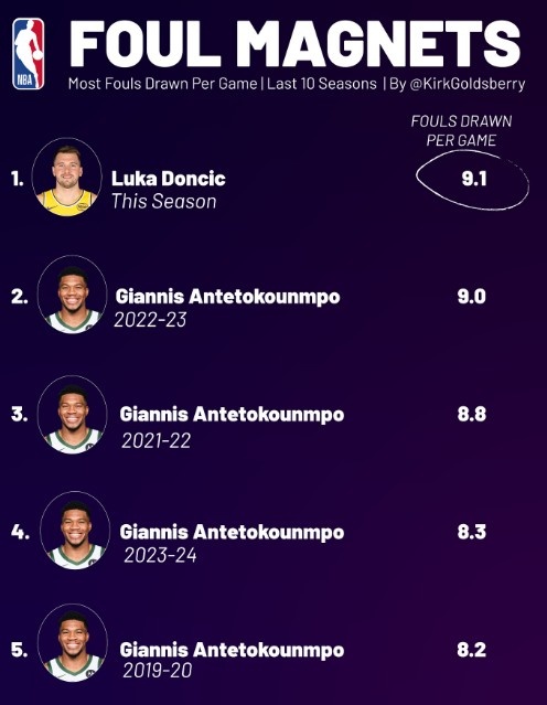近10年场均造犯规榜Top5:本赛季东契奇9.1次最多 字母哥独霸4席